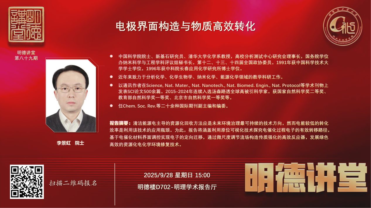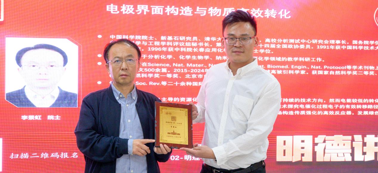 9月28日下午,化工与化学学院“明德讲堂”第八十九期在明理学术报告厅成功举办。清华大学李景虹院士应邀来校为广大师生作题为“电极界面构造与物质高效转化”的学术报告。