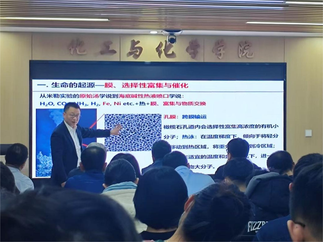 王博教授从生命的起源讲起,详细介绍了自己的研究历程,描述其课题组聚焦清洁能源领域的关键分离与传质过程,构建兼具选择性识别与高效传输能力的仿生框架材料的技术,为在场师生提供了一场生动的学术报告。