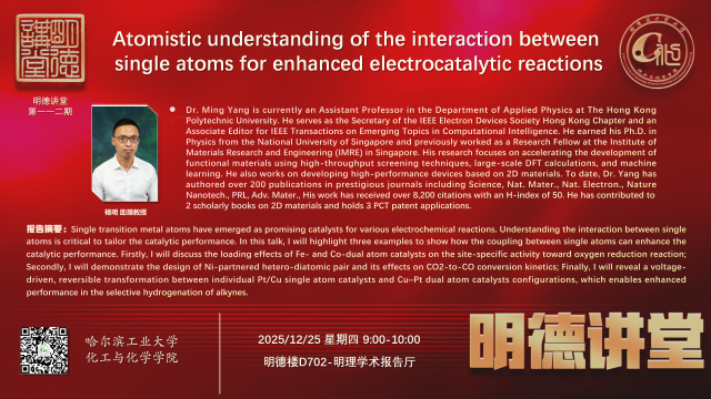 Dr. Ming Yang is currently an Assistant Professor in the Department of Applied Physics at The Hong Kong Polytechnic University. He serves as the Secretary of the IEEE Electron Devices Society Hong Kong Chapter and an Associate Editor for IEEE Transactions on Emerging Topics in Computational Intelligence. He earned his Ph.D. in Physics from the National University of Singapore and previously worked as a Research Fellow at the Institute of Materials Research and Engineering (IMRE) in Singapore. His research focuses on accelerating the development of functional materials using high-throughput screening techniques, large-scale DFT calculations, and machine learning. He also works on developing high-performance devices based on 2D materials. To date, Dr. Yang has authored over 200 publications in prestigious journals including Science, Nat. Mater., Nat. Electron., Nature Nanotech., PRL, Adv. Mater., His work has received over 8,200 citations with an H-index of 50. He has contributed to 2 scholarly books on 2D materials and holds 3 PCT patent applications.