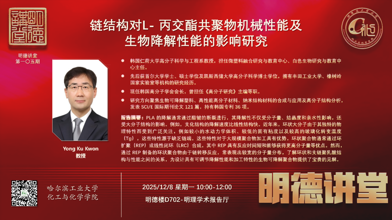 12月8日上午,化工与化学学院“明德讲堂”第一百零五期在明理学术报告厅成功举办。韩国仁荷大学高分子材料与工程系教授Yong Ku Kwon应化工与化学学院的邀请,作题为“链结构对L- 丙交酯共聚物机械性能及生物降解性能的影响研究”的学术报告。此次报告由张科副教授主持。