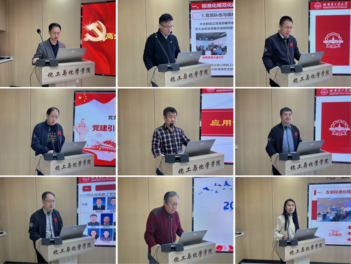 会上,9位教职工党支部书记结合2025年党支部开展的工作,从党建与中心工作双融合情况、支部特色工作与经验分享、存在问题与整改措施及2026年工作计划等方面进行述职汇报。