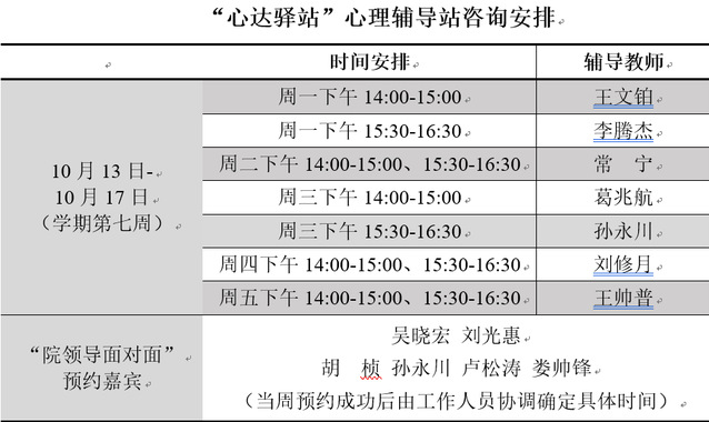 为更好地为化工与化学学院学子提供生活成长全方位的指导,帮助学生解决生涯规划、学业压力和生活困惑等问题,搭建一个开放的、更具针对性的交流平台,本学期化工与化学学院“心达驿站”心理辅导站继续开放,充分发挥学工队伍的专长为同学们的成长服务。学工队伍教师作为固定师资采取值班咨询制。