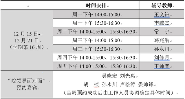 2.“院领导面对面”采用灵活预约的形式,学生可根据自身需求预约嘉宾,预约成功后由工作人员协调确定具体咨询时间,每人(每团队)咨询时间在30-60分钟左右。