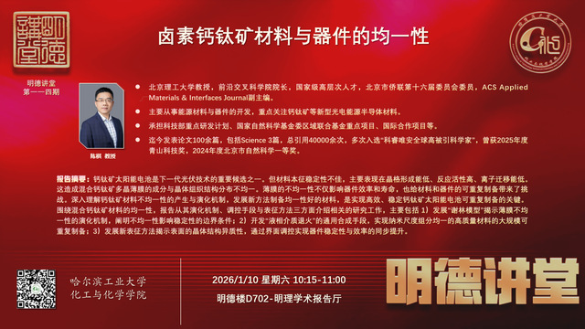 钙钛矿太阳能电池是下一代光伏技术的重要候选之一。但材料本征稳定性不佳,主要表现在晶格形成能低、反应活性高、离子迁移能低。这造成混合钙钛矿多晶薄膜的成分与晶体组织结构分布不均一。薄膜的不均一性不仅影响器件效率和寿命,也给材料和器件的可重复制备带来了挑战。深入理解钙钛矿材料不均一性的产生与演化机制,发展新方法制备均一性好的材料,是实现高效、稳定钙钛矿太阳能电池可重复制备的关键。围绕混合钙钛矿材料的均一性,报告从其演化机制、调控手段与表征方法三方面介绍相关的研究工作,主要包括 1)发展“谢林模型”揭示薄膜不均一性的演化机制,阐明不均一性影响稳定性的边界条件;2)开发“液相介质退火”的通用合成手段,实现纳米尺度组分均一的高质量材料的大规模可重复制备;3)发展新表征方法揭示表面的晶体结构异质性,通过界面调控实现器件稳定性与效率的同步提升。