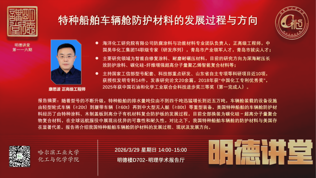 应刘宇艳教授邀请,海洋化工研究院有限公司康思波(正高级工程师、防腐涂料及功能材料团队负责人)到我校进行学术访问,并开展化工与化学学院“明德讲堂”学术报告,欢迎广大师生参加。