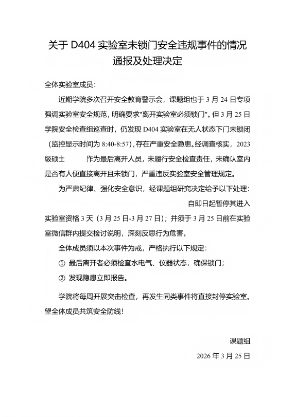 检查次日,学院某课题组即发布安全违规处理通报(关键信息已隐去)