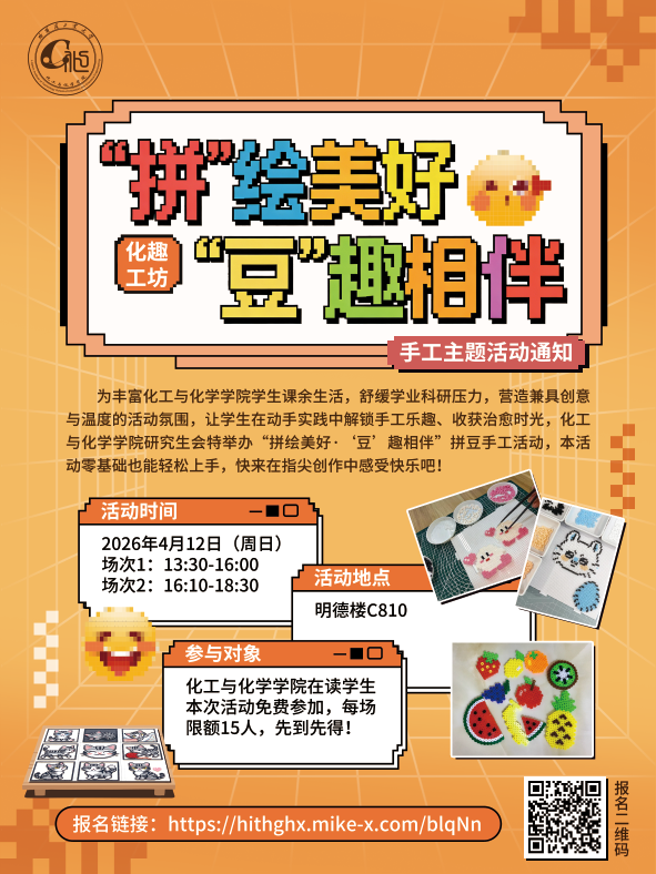 为丰富化工与化学学院学生课余生活,舒缓学业科研压力,营造兼具创意与温度的活动氛围,让学生在动手实践中解锁手工乐趣、收获治愈时光,化工与化学学院研究生会特举办“拼绘美好·‘豆’趣相伴”拼豆手工活动,本活动零基础也能轻松上手,快来在指尖创作中感受快乐吧!