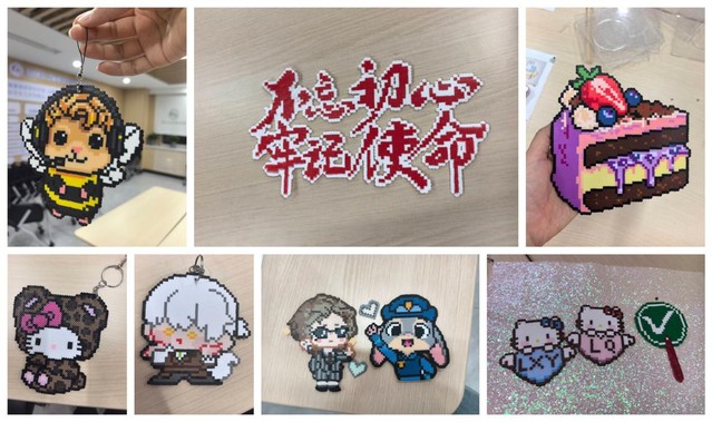 巧手生趣,豆粒成画。一件件生动鲜活的作品在同学们的指尖次第绽放:色彩明丽、层次分明的美味蛋糕令人垂涎,憨态可掬的小蜜蜂翅膀轻振、条纹栩栩如生,形态各异的Hello Kitty粉嫩可爱,童趣盎然。活动落幕,同学们纷纷在社交平台晒出自己的拼豆作品,分享专注创作带来的喜悦与成就感,彼此的情谊也在指尖的交流中悄然升温。