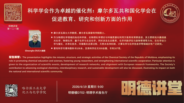 应刘杨副研究员邀请,摩尔多瓦国立大学教授,摩尔多瓦国家科学院院士Gheorghe DUCA教授到我校进行学术访问,并开展化工与化学学院“明德讲堂”学术报告,欢迎广大师生参加。