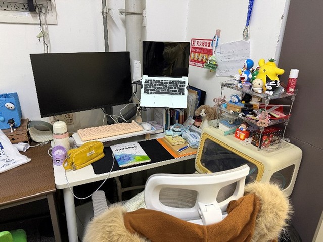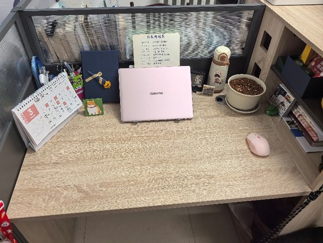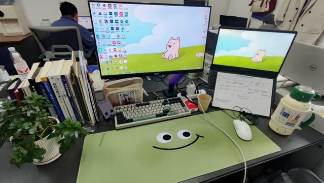 刘禹同学的书桌兼具理性秩序与感性温度。原本杂乱的空间被重构为层次分明、功能清晰的高效科研区,多屏协同与合理外设布局尽显高效实践能力。他以绿色为主调统一视觉,搭配长寿花、笑脸桌垫与励志标语,在实用之外注入审美与精神力量,营造松弛科研氛围,让工位成为生活态度的具象表达。